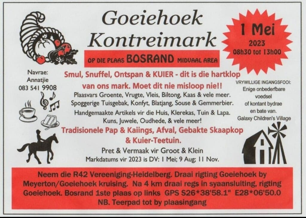 ‘n Vrywillige ingangsfooi, asook kaartjies vir ‘n handgemaakte biltongkerwer en ‘n pragtige braaiplank wat uitgeloot word ten bate van Galaxy, sal op die mark verkoop word.