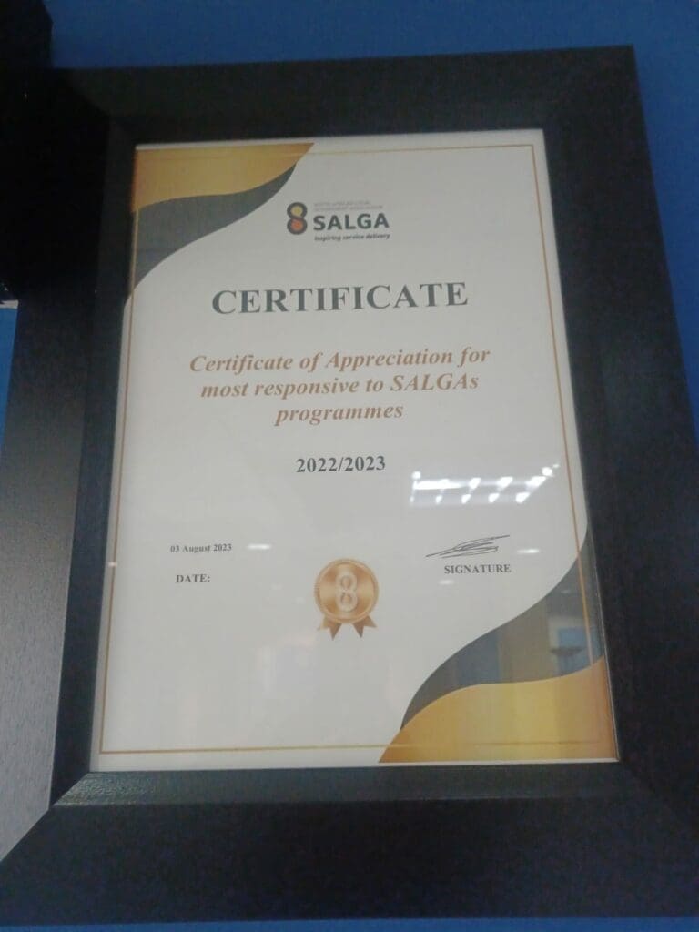 The South African Local Government Association (SALGA) has once again recognised Midvaal Local Municipality’s exemplary performance by bestowing it with a certificate of appreciation for the most consistent early payment of levies and another for being the most responsive to SALGA programmes.