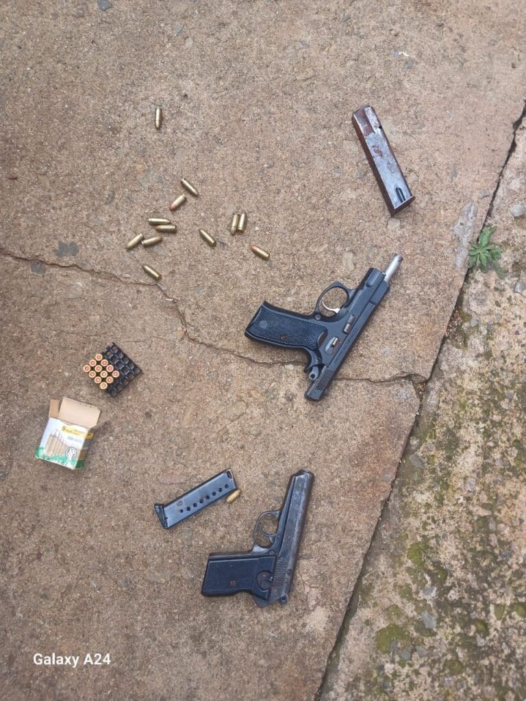 The police arrested the suspect for being in South Africa illegally and for possessing unlicensed firearms and ammunition, including 32 auto rounds and 12 live rounds.