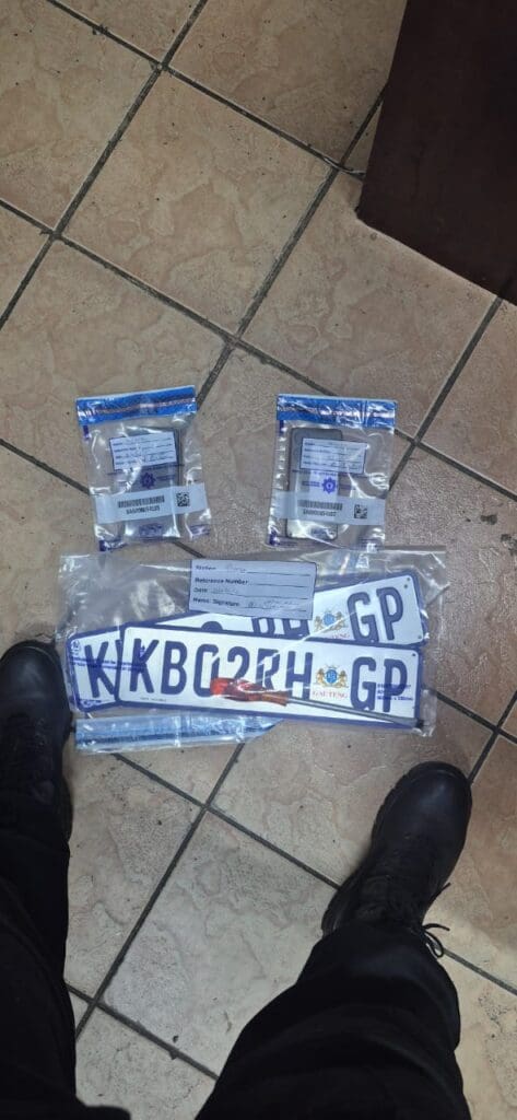 The suspects were found in possession of a black Samsung cellphone and Honor cellphone, both of which were booked as exhibits. Police also seized a pair of number plates and a flat screwdriver with an orange handle.